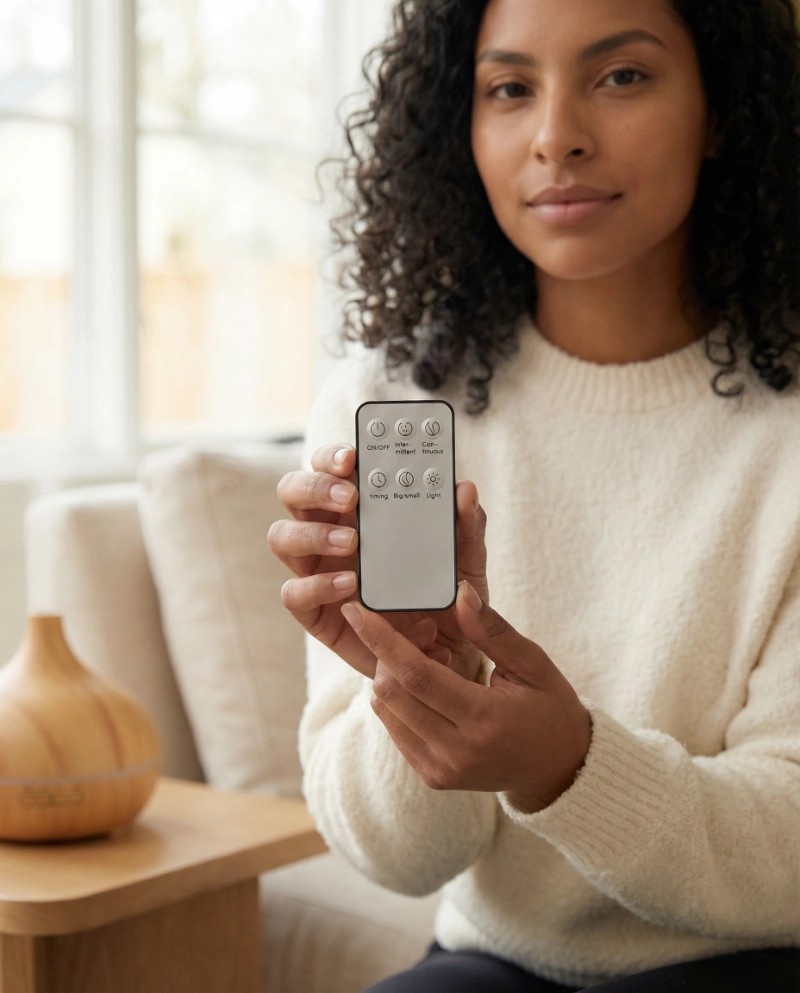 Mit der praktischen Fernbedienung lässt sich der Aromadiffuser bequem aus der Entfernung steuern. So können die Nebelintensität, der LED-Lichtring und die Timer-Funktion ganz einfach angepasst werden. Das sorgt für zusätzlichen Komfort und macht die Nutzung im Alltag besonders angenehm.